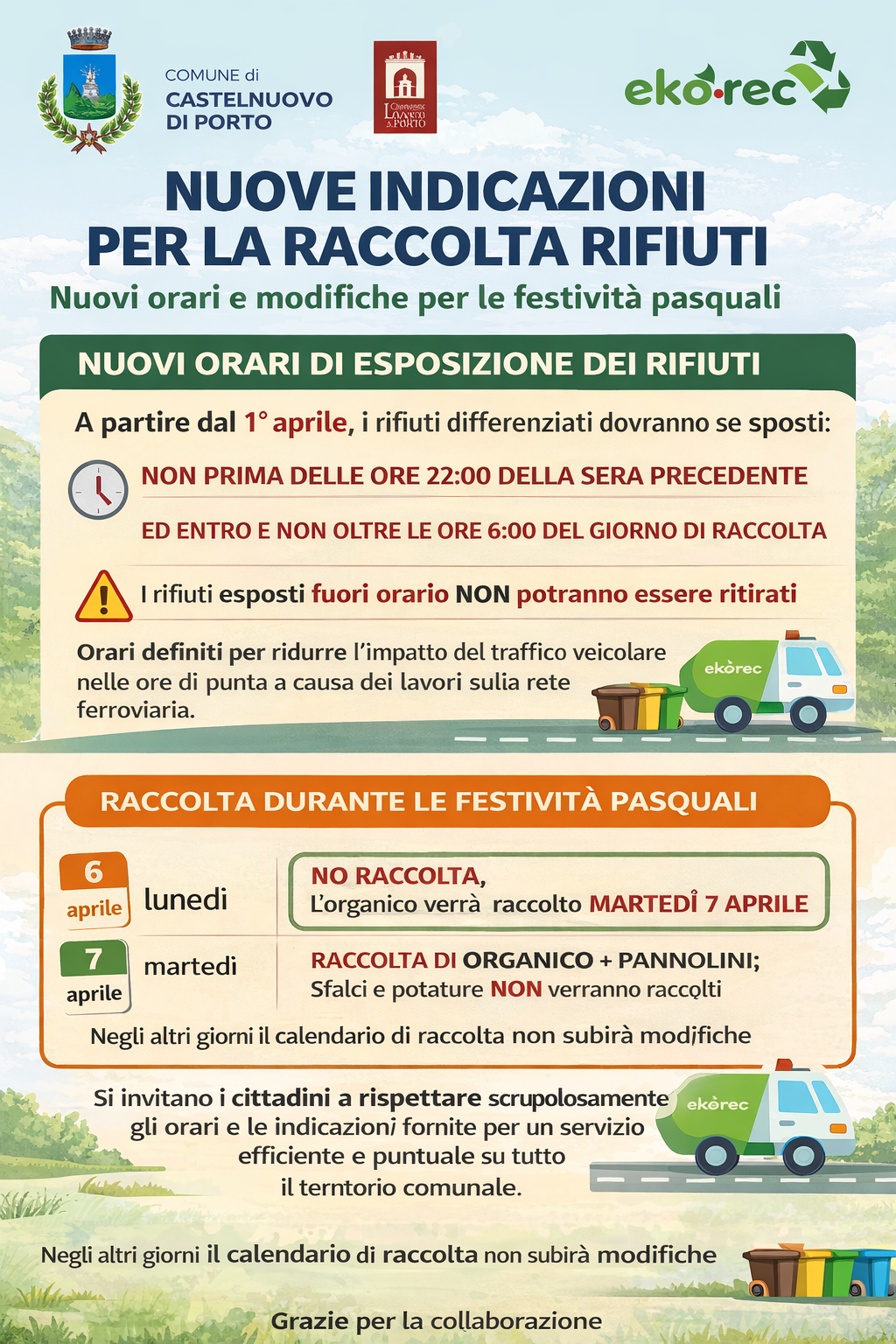 Nuovi orari di esposizione rifiuti e variazioni raccolta per le festività pasquali
