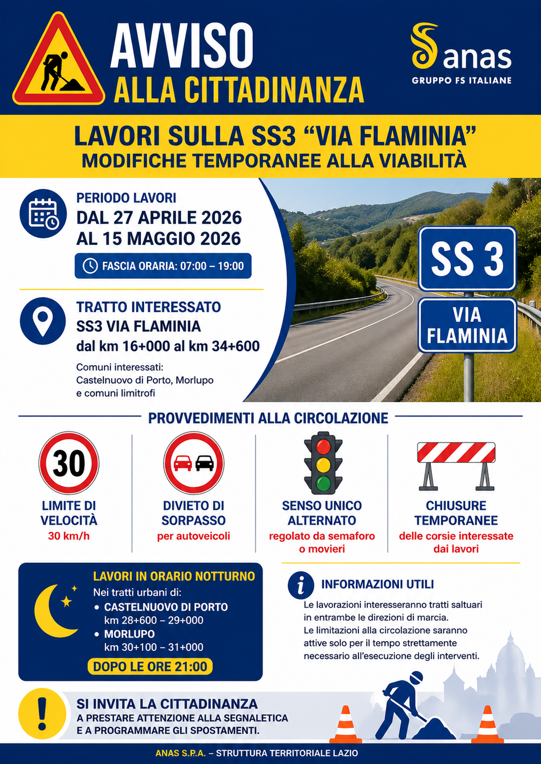 Dal 27 aprile al 15 maggio 2026 lavori di manutenzione straordinaria sulla SS3 Via Flaminia con limitazioni al traffico e senso unico alternato.