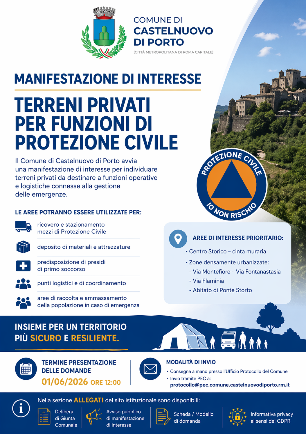 Il Comune di Castelnuovo di Porto, in attuazione della Deliberazione di Giunta Comunale n. 32 del 20.02.2026, promuove una manifestazione di interesse finalizzata all’individuazione di terreni privati situati nel territorio comunale, da destinare a funzioni operative e logistiche connesse alla gestione delle emergenze di Protezione Civile.
